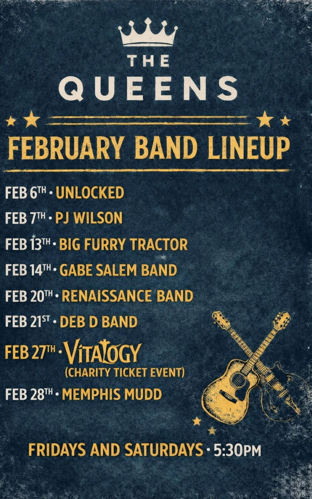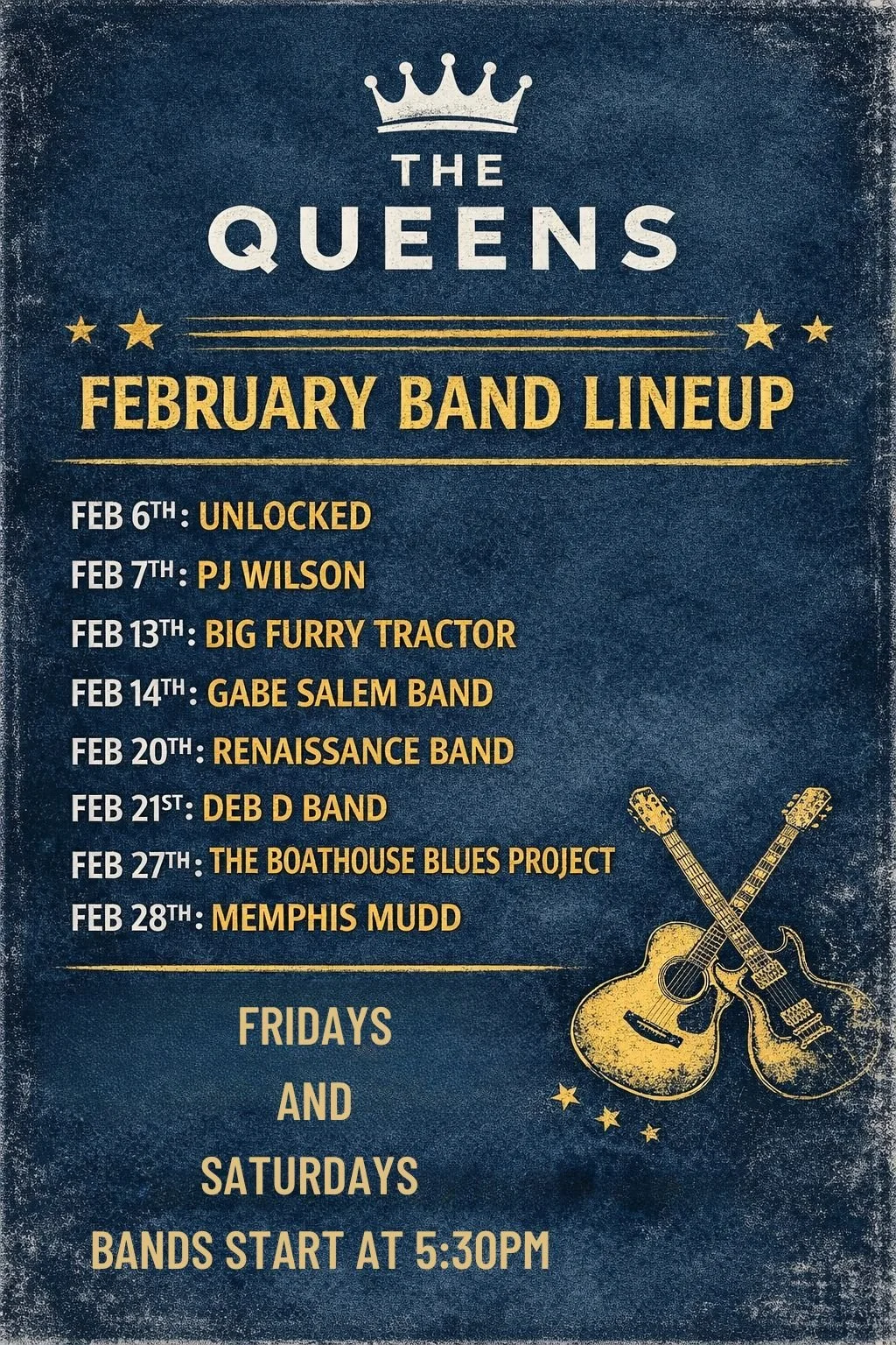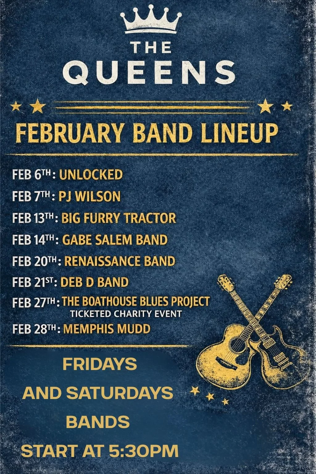 QUEENS LIVE ORIGINAL MUSIC - SUN/WED/THURS COMING FRI & SAT WINTER 2025. *MUST CHECK CALENDAR